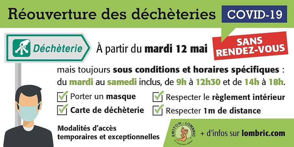 A PARTIR DU 12 MAI : réouverture des déchèteries de notre territoire, du mardi au samedi inclus, sans rendez-vous.