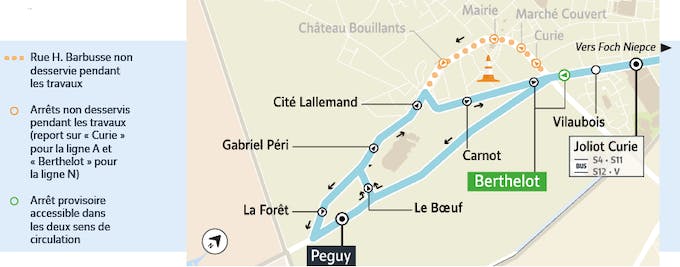• Les arrêts « Curie », « Marché Couvert », « Mairie » et « Château Bouillants » ne seront plus desservis. Report possible à l’arrêt provisoire « Berthelot ».