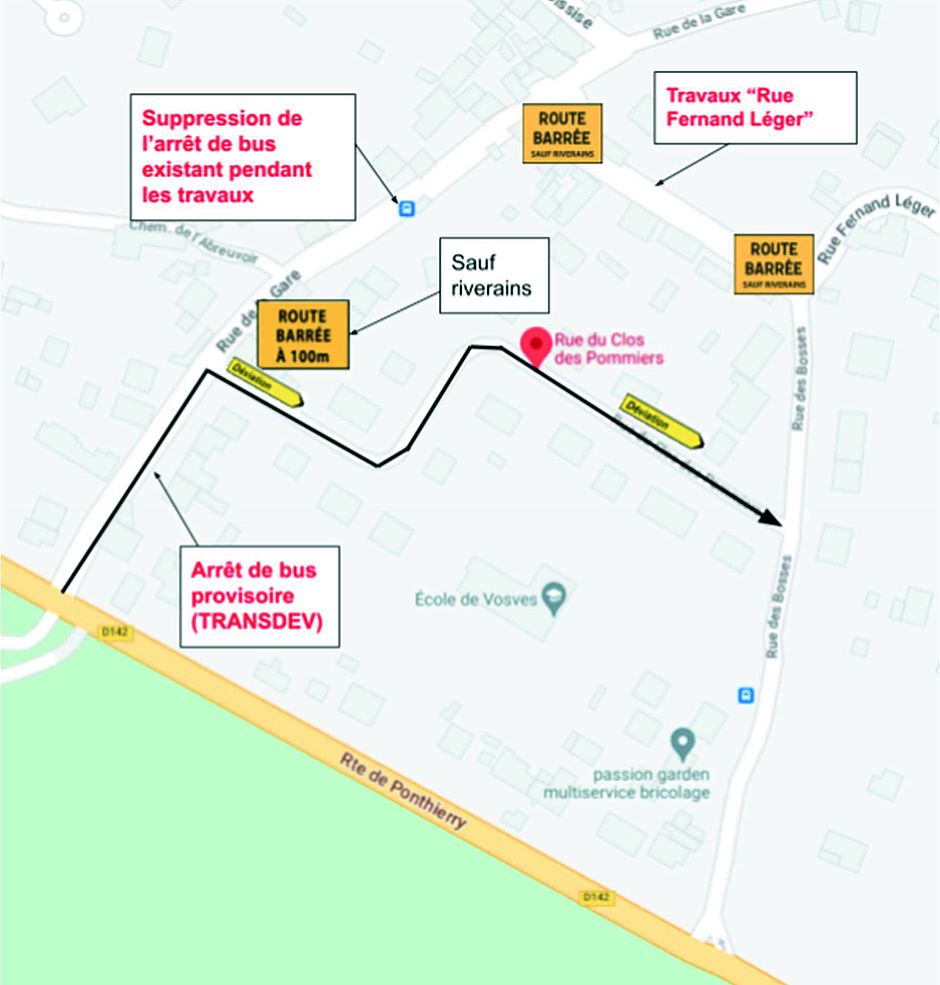 Pour information, une déviation sera mise en place (voir ci-dessus) pour les transports en commun et l’arrêt de bus habituel sera déplacé rue de la gare afin de conserver une desserte dans le quartier par la société Transdev.
