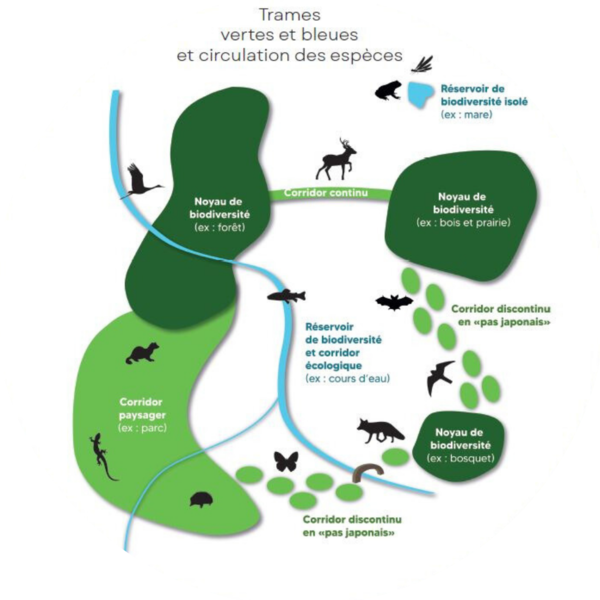 Selon leurs besoins et le milieu auquel ils appartiennent, ils circulent en utilisant les trames vertes (milieux végétalisés) et trames bleues (milieux aquatiques) au moyen d’axe de circulation continus comme les alignements de haies, les bords de chemins et les rives, ou discontinus comme les mares, les bosquets ou les îlots refuges.