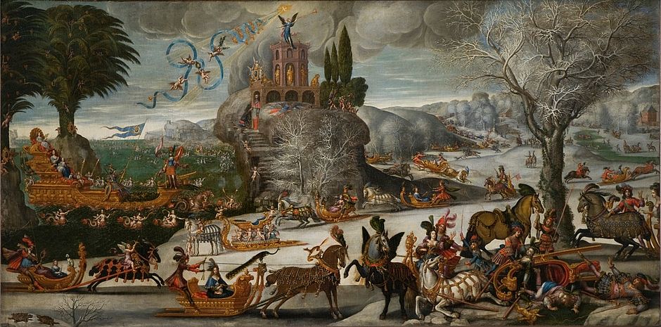 L’Eau fait partie de la série des Quatre Éléments installée dans le cabinet d’Anne d’Autriche (1601-1666) au château de Richelieu. La composition de L’Eau se divise suivant une diagonale centrale : à gauche l’essentiel du message politique et à droite une fête sur la glace. Un vaisseau apparait à gauche avec la France à sa proue. L’équipage est formé de la reine Anne d’Autriche avec Philippe de France, le dauphin (futur Louis XIV) et Louis XIII, brandissant une oriflamme ornée d’une image de la Vierge en référence à la consécration de la France à la Madone le 15 août 1637. Au centre, Richelieu sort du temple de la Gloire surmonté de la Renommée. Enfin, le Saint-Esprit fait tomber des cieux des rayons lumineux sur Louis XIII, accompagnés de treize couronnes et d’un cordon bleu portant la croix du Saint-Esprit. La partie droite présente des scènes anecdotiques : le renversement du carrosse et de ses passagers, les échanges entre hommes et femmes, l’agitation d’autres personnages. L’eau gelée est l’occasion de promenades en traineaux, prétexte pour le peintre à l’expression d’un raffinement ornemental hors du commun évoquant les fastes de la cour de Lorraine entre les xvie et xviie siècles. Claude Déruet était peintre et ordonnateur des fêtes à la cour de Nancy. Le cycle des Quatre Éléments montre que l’artiste s’inscrit dans la tradition du maniérisme tardif, aux effets raffinés et précieux, en prolongeant le goût pour les parades et les effets spectaculaires.