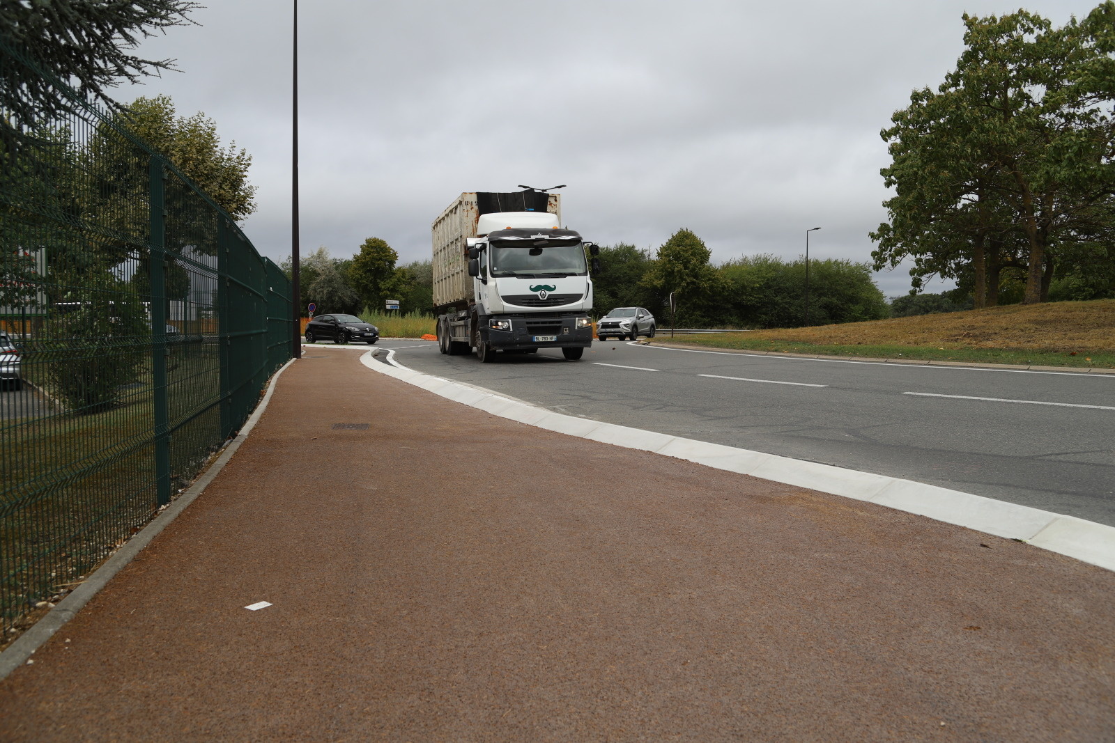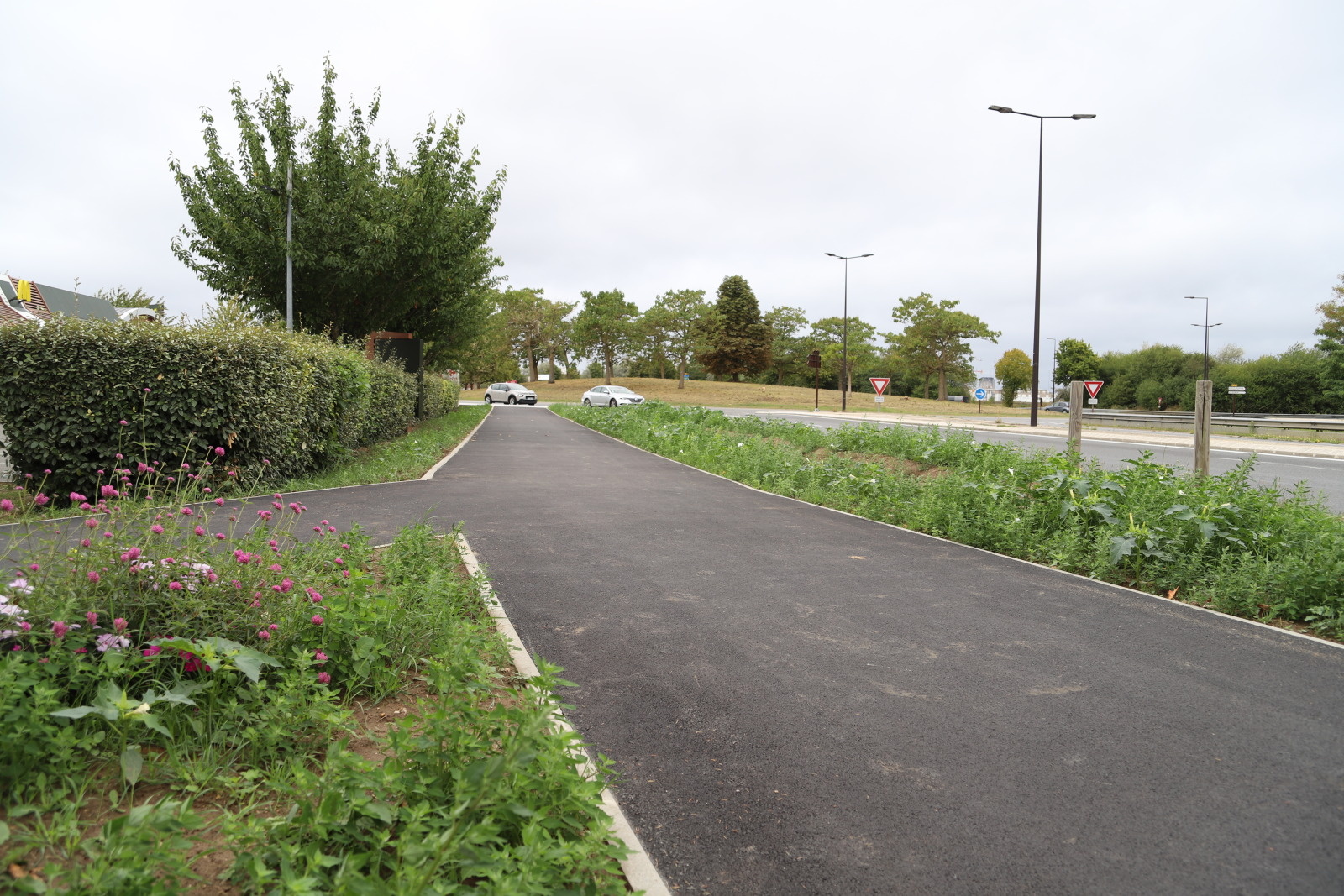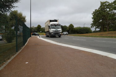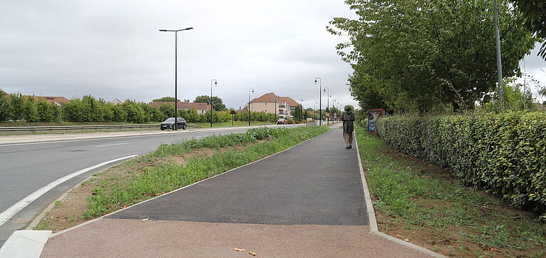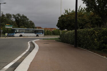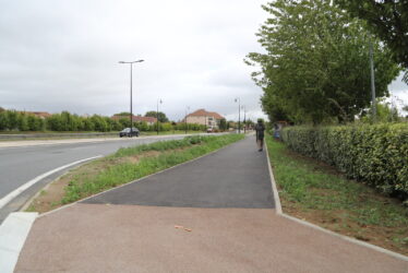 Sur la RD 636, à l’ouest, côté Carrefour Market, la voie verte provisoire a été pérennisée en béton désactivé. Au bord du giratoire, une voie verte en béton désactivé a été créée. Entre le Carrefour Market et le McDonald’s la traversée piétons/cycles a été aménagée avec une réduction de la largeur de la chaussée. Enfin, le long du McDonald’s, une voie verte en enrobé a été créée sur l’accotement.