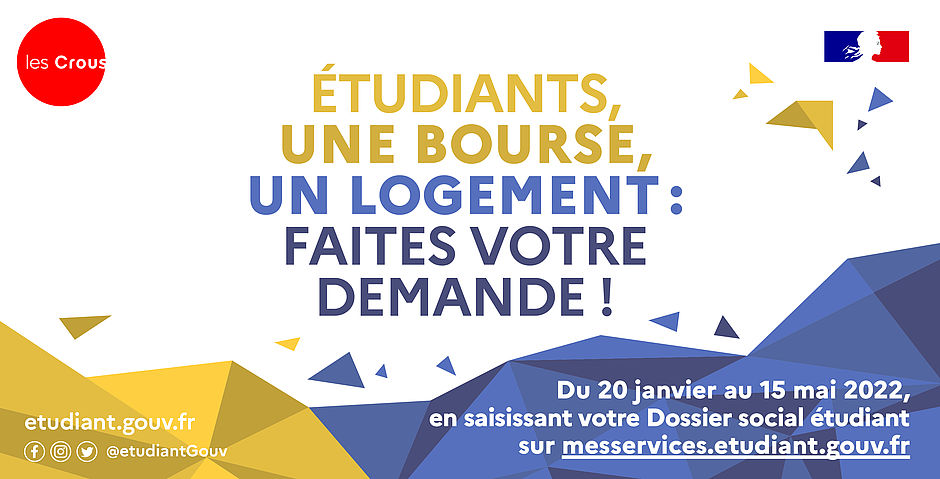 En partenariat avec le Ministère de l’Éducation Nationale et l’Enseignement Supérieur et de la Recherche et de l’Innovation, le Crous de l’académie de Créteil appelle les (futurs) étudiants à réaliser dès maintenant leurs démarches pour la rentrée 2022. Du 20 janvier au 15 mai, les étudiants peuvent faire leurs demandes de bourse et de logement universitaire pour septembre 2022.