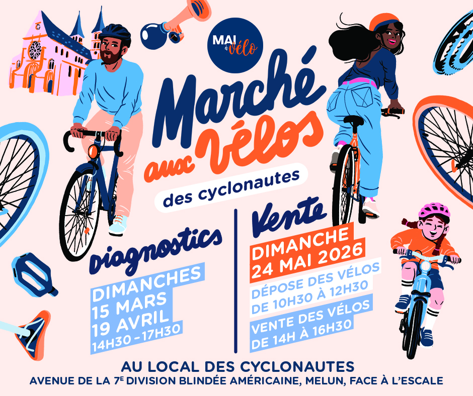 Facebook Twitter X LinkedIn 24MAI Mobilité Marché aux vélos Dans le cadre de Mai à Vélo, l’association Les Cyclonautes, avec le soutien de l’Agglomération Melun Val de Seine, organise la 2ᵉ édition de son Marché aux Vélos le dimanche 24 mai 2026 à Melun.24... 10:30 à 16:30 Les cyclonautesAvenue de la 7e division blindée américaine77000 Melun