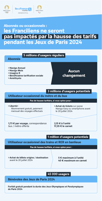 Le temps des Jeux de Paris 2024, les tarifs des transports en commun augmentent en Île-de-France. Objectif : financer les renforts de l’offre de transport liés aux flux exceptionnels de voyageurs. Les Franciliens ne subiront pas cette hausse, mais ils devront anticiper l’achat des tickets occasionnels avant le mois de juillet.