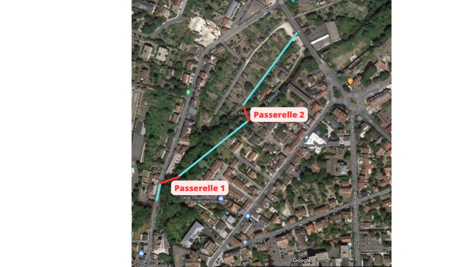 Les 2 passerelles récemment ouvertes se situent du 14 Rue des Trois Moulins au 33 Rue des fabriques (derrière le jardin des Carmes) dans le quartier de l’Almont