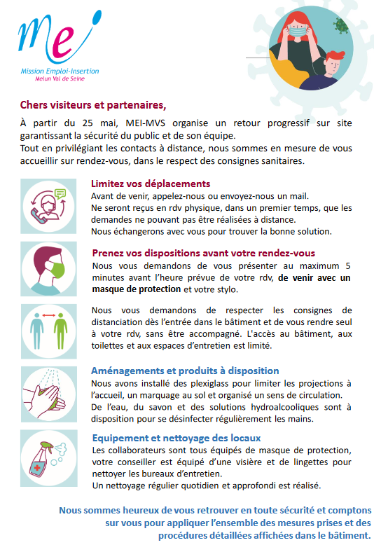 À partir du 25 mai, MEI-MVS organise un retour progressif sur site. Tout en privilégiant les contacts à distance, ils vous accueilleront sur rendez-vous, dans le respect des consignes sanitaires.
